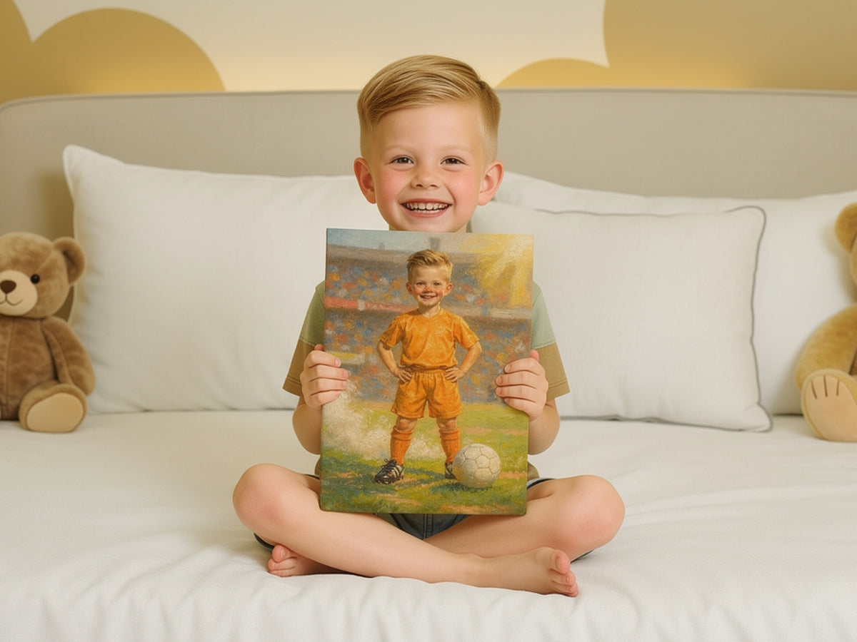 'Mijn zoontje was helemaal trots toen hij zichzelf als profvoetballer zag. Het heeft een mooie plek in zijn kamer gekregen!'