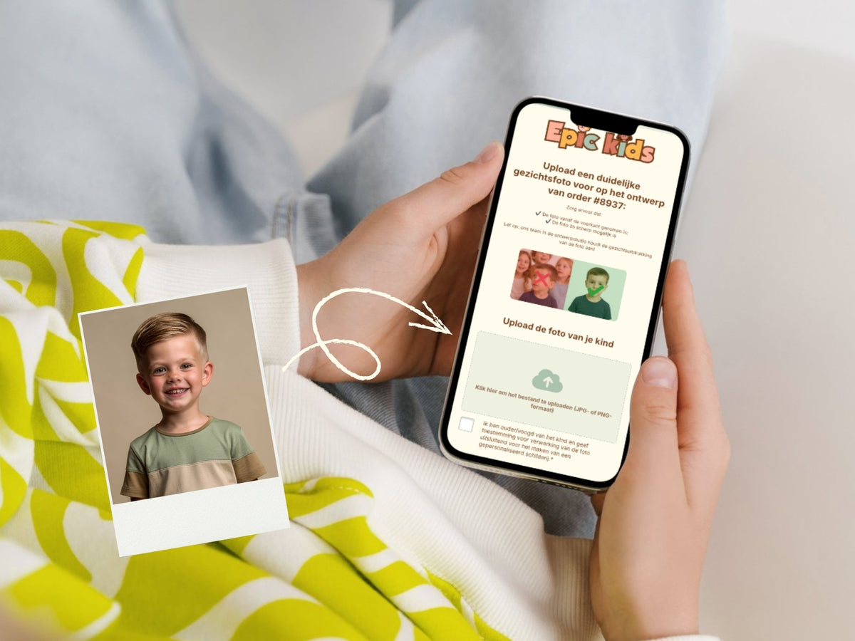 Na je bestelling ontvang je direct een mail met een uploadlink. Daar voeg je de foto(‘s) van je kind toe.