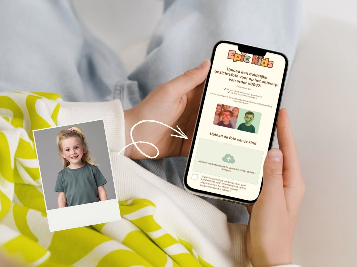 Na je bestelling ontvang je direct een mail met een uploadlink. Daar voeg je de foto(‘s) van je kind toe.