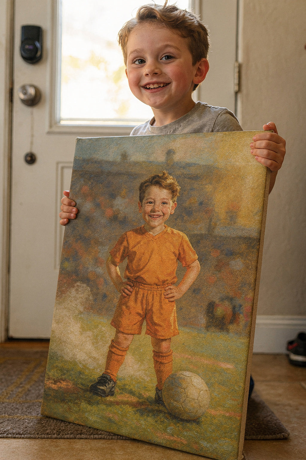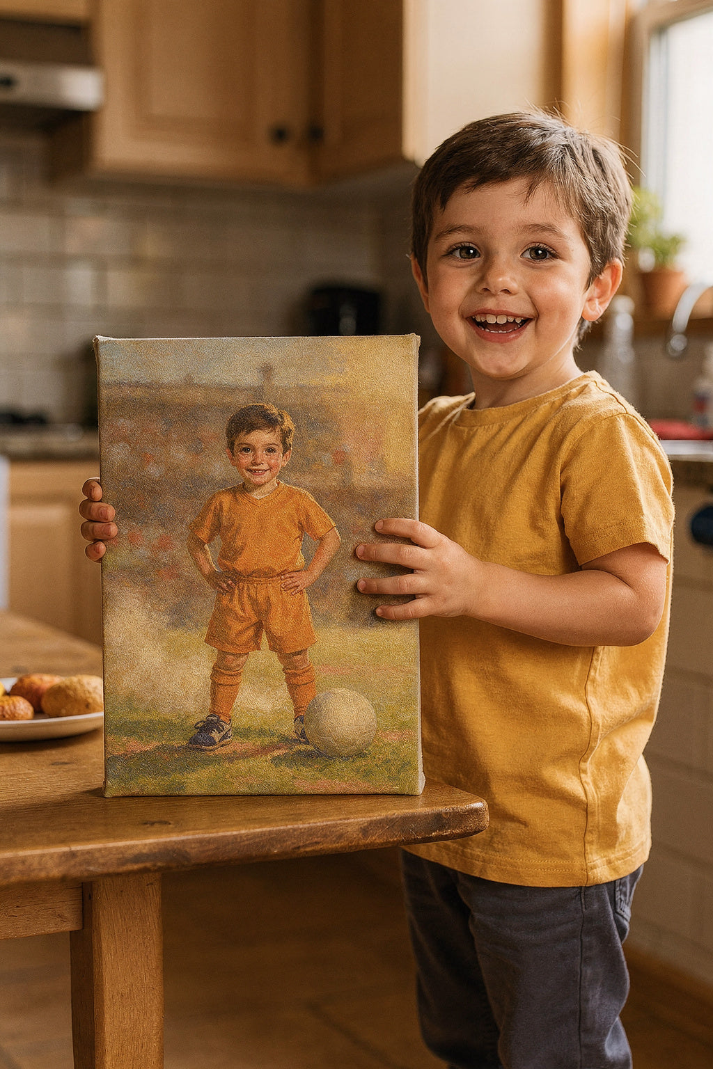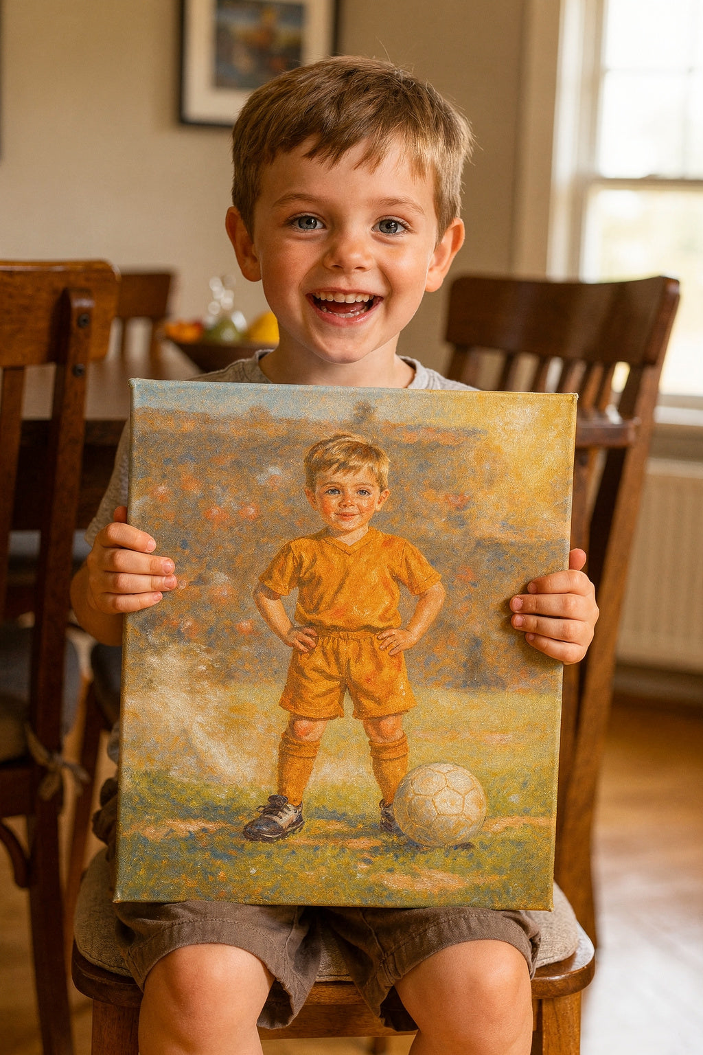 'Mijn zoontje was helemaal trots toen hij zichzelf als profvoetballer zag. Het heeft een mooie plek in zijn kamer gekregen!'